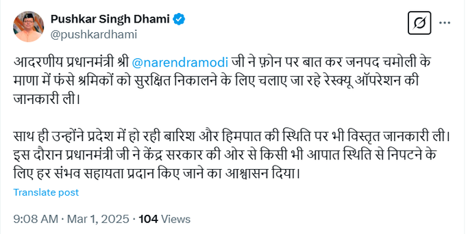 घटना को लेकर सीएम पुष्कर सिंह धामी ने कहा कि आदरणीय प्रधानमंत्री नरेंद्र मोदी जी ने फ़ोन पर बात कर जनपद चमोली के माणा में फंसे श्रमिकों को सुरक्षित निकालने के लिए चलाए जा रहे रेस्क्यू ऑपरेशन की जानकारी ली. साथ ही उन्होंने प्रदेश में हो रही बारिश और हिमपात की स्थिति पर भी विस्तृत जानकारी ली. इस दौरान प्रधानमंत्री जी ने केंद्र सरकार की ओर से किसी भी आपात स्थिति से निपटने के लिए हर संभव सहायता प्रदान किए जाने का आश्वासन दिया.