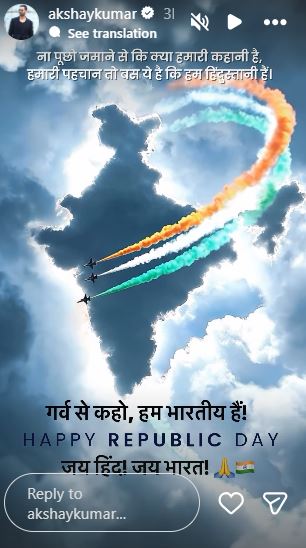 अक्षय कुमार ने इंस्टाग्राम पर लिखा, “गर्व से कहें कि हम भारतीय हैं। गणतंत्र दिवस की शुभकामनाएं। जय हिंद, जय भारत।”