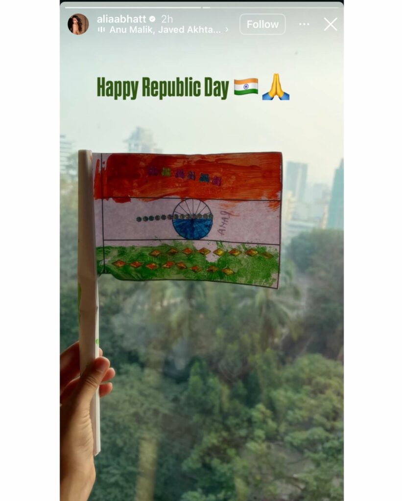 अभिनेत्री आलिया भट्ट ने अपनी बेटी राहा द्वारा बनाए गए तिरंगे की तस्वीर साझा करते हुए सभी को गणतंत्र दिवस की शुभकामनाएं दीं, जिसे फैंस ने काफी पसंद किया।