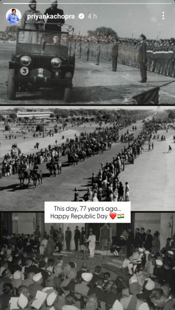 अभिनेत्री प्रियंका चोपड़ा जोनस ने भी इस मौके पर एक पुरानी तस्वीर शेयर की और देश पर गर्व जताते हुए गणतंत्र दिवस का महत्व बताया।