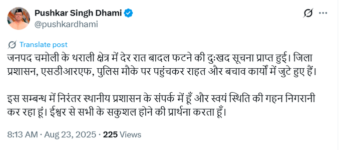 उत्तराखंड के मुख्यमंत्री पुष्कर सिंह धामी ने ट्वीट किया, “जनपद चमोली के थराली क्षेत्र में देर रात बादल फटने की दुःखद सूचना प्राप्त हुई. जिला प्रशासन, एसडीआरएफ, पुलिस मौके पर पहुंचकर राहत और बचाव कार्यों में जुटे हुए हैं. इस संबंध में निरंतर स्थानीय प्रशासन के संपर्क में हूं और स्वयं स्थिति की गहन निगरानी कर रहा हूं. ईश्वर से सभी के सकुशल होने की प्रार्थना करता हूं.”