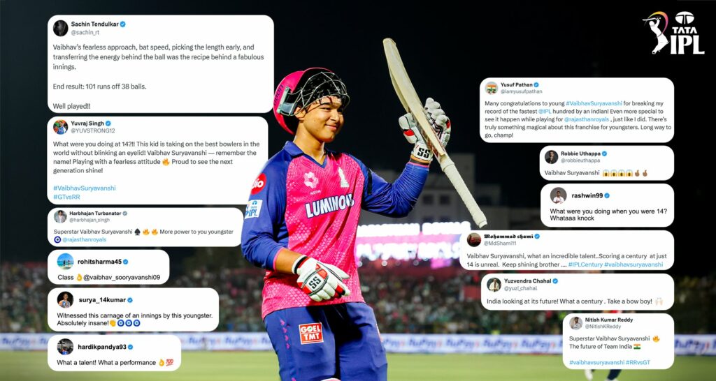 वैभव की इस बल्लेबाजी के कायल क्रिकेट स्टार्टस ने उनकी तारीफों के पुल बांध दिए. खिलाड़ियों की तारीफों से सोशल मीडिया भर गया. वैभव के इस रिकॉर्ड पर उन्हें देशभर से बधाई मिल रही है. चलिए बताते हैं कि आखिर किसने क्या कहा.