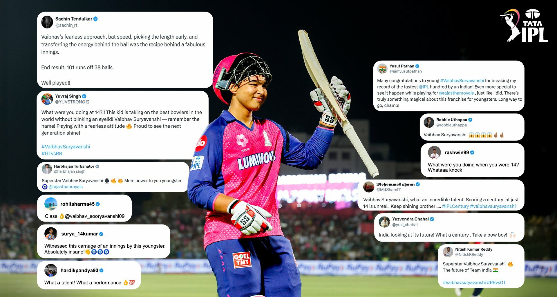 Many congratulations to young #VaibhavSuryavanshi for breaking my record of the fastest @IPL hundred by an Indian! Even more special to see it happen while playing for @rajasthanroyals , just like I did. There’s truly something magical about this franchise for youngsters. Long… pic.twitter.com/kVa2Owo2cc