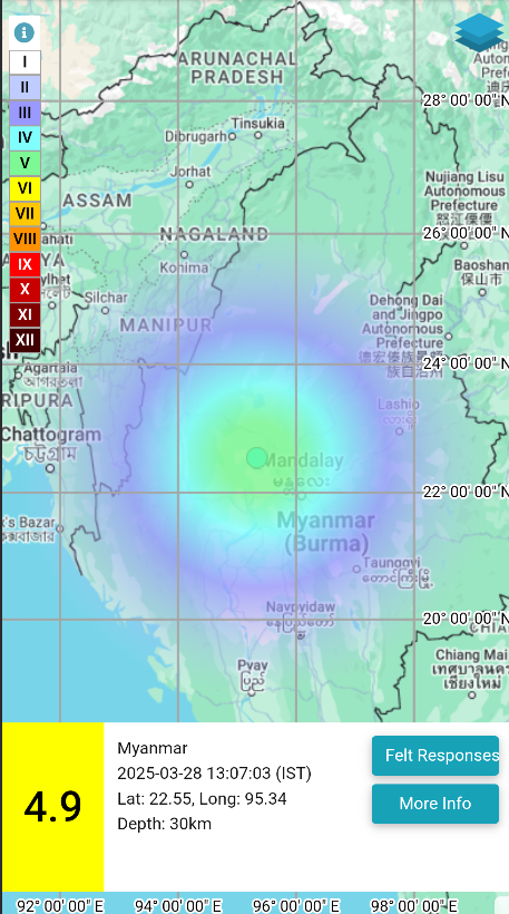 नेशनल सेंटर फॉर सीस्मोलॉजी ने बताया कि म्यांमार में रिक्टर पैमाने पर 4.9 तीव्रता का भूकंप आया. यह तीसरा झटका है, इससे पहले रिक्टर पैमाने पर 7.2 तीव्रता का भूकंप आया था.