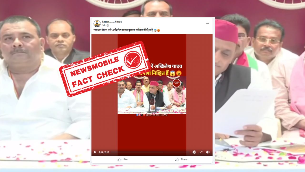 सोशल मीडिया पर उत्तर प्रदेश के पूर्व मुख्यमंत्री और समाजवादी पार्टी के मुखिया अखिलेश यादव की प्रेस वार्ता का एक वीडियो तेजी से वायरल हो रहा है। वीडियो में अखिलेश यादव को यह बोलते हुए सुना जा सकता है कि गाय की और चीजों का सेवन करें। कुछ यूजर्स इस वीडियो को शेयर कर दावा कर रहे हैं कि अखिलेश यादव ने गाय के सेवन की बात कही है।