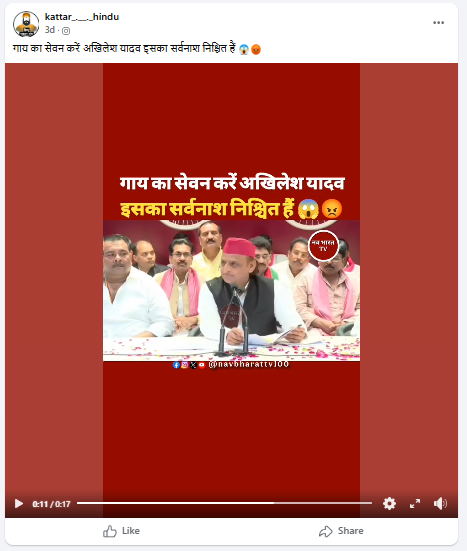फेसबुक पर वायरल वीडियो को शेयर कर हिंदी भाषा के कैप्शन में लिखा गया है कि “गाय का सेवन करें अखिलेश यादव इसका सर्वनाश निश्चित हैं।”