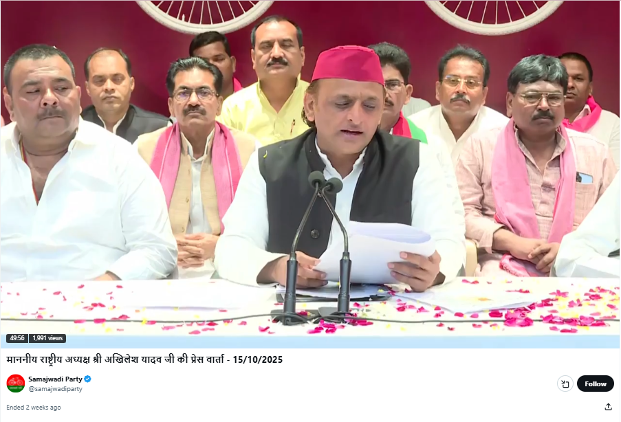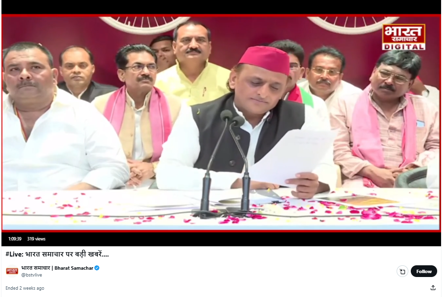 सोशल मीडिया पर वायरल हो रहे वीडियो की सत्यता जानने के लिए हमने पड़ताल की। पड़ताल के दौरान हमने सबसे पहले वायरल वीडियो को कुछ कीफ्रेम्स में तोड़ा और फिर गूगल लेंस के माध्यम से खोजना शुरू किया। खोज के दौरान हमें वायरल वीडियो भारत समाचार के एक्स हैंडल द्वारा अक्टूबर 15, 2025 को सपा की प्रेस कॉन्फ्रेंस का लाइव वीडियो मिला।