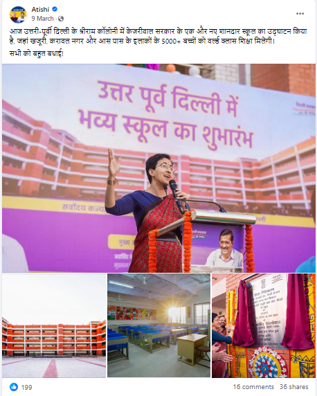 उपरोक्त प्राप्त जानकारी के आधार पर हमने गूगल पर बारीकी से खोजना शुरू किया। खोज के दौरान हमें सबसे पहले आतिशी मार्लेना के फेसबुक पर एक पोस्ट मिली जहां दिल्ली के श्रीरामं कॉलोनी में एक स्कूल के उद्घाटन की जानकारी दी गयी थी। पोस्ट में बताया गया था कि मार्च, 2024 में आतिशी मार्लेना ने दिल्ली के श्री राम कॉलोनी में एक स्कूल का उद्घाटन किया था।