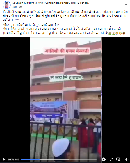 सोशल मीडिया पर दिल्ली की मुख्यमंत्री आतिशी मार्लेना का एक वीडियो तेजी से वायरल हो रहा है। यह वीडियो उनके एक भाषण के दौरान का है, जहां कुछ लोगों को किसी बात को लेकर उनका विरोध करते हुए देखा जा सकता है। इसी वीडियो को सोशल मीडिया पर शेयर कर हिंदी भाषा के कैप्शन में लिखा गया है कि जब आतिशी ने श्री राम कॉलोनी में जय श्री राम बोलकर अपना भाषण शुरू किया तो वह बैठे समुदाय विशेष के लोगों ने इसका जमकर विरोध किया।