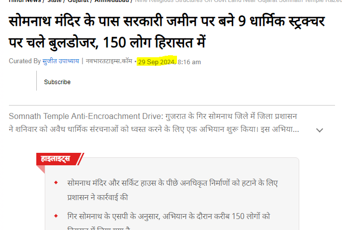सोशल मीडिया पर वायरल हो रहे वीडियो के साथ शेयर किए जा रहे दावे की पड़ताल के लिए हमने सबसे पहले यह जानने का प्रयास किया कि क्या गुजरात के सोमनाथ में प्रशासन ने कोई बुलडोजर कार्रवाई की है?, इसके लिए हमने गूगल पर कुछ संबंधित कीवर्ड्स से गूगल पर खोजना शुरू किया। खोज के दौरान Navbhart times की वेबसाइट पर सितंबर 29, 2024 को छपा एक लेख मिला। जहां यह जानकारी दी गयी है कि सोमनाथ मंदिर के पास सरकारी जमीन पर बने करीब 9 धार्मिक इमारतों पर बुलडोजर कार्रवाई की गयी है।