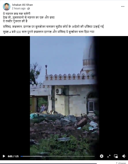 फेसबुक पर वायरल वीडियो को शेयर कर हिंदी भाषा के कैप्शन में लिखा गया कि ये नफ़रत कब तक चलेगी देख लो… ‘मुसलमानो से नफ़रत का एक और दृश्य ये तस्वीर गुजरात की है मस्जिद, कब्रस्तान, दरगाह पर बुलडोजर चलाकर सुप्रीम कोर्ट के आदेशो की धज्जिया उड़ाई गई सुबह 4 बजे 500 साल पुराने क़ब्रस्तान दरगाह और मस्जिद पे बुल्डोजर चला दिया गया। ‘