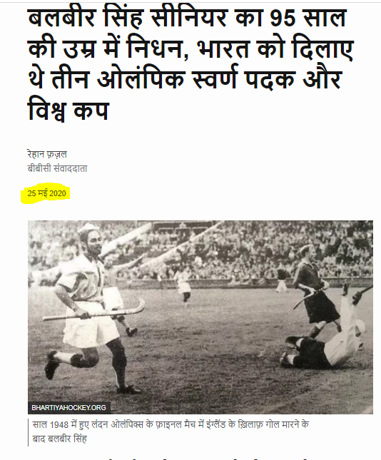 उपरोक्त प्राप्त जानकारी की पुष्टि तथा सटीक जानकारी के लिए हमने गूगल पर और बारीकी से खोजना शुरू किया। जिसके बाद हमें खिलाड़ी बलबीर सिंह के निधन की खबर बीबीसी हिंदी की वेबसाइट पर भी मई 25, 2020 को छपे लेख में मिली। लेख के मुताबिक, बलबीर सिंह सीनियर का निधन मई 25, 2020 को 95 वर्ष की आयु में हो गया था। उन्हें स्वास्थ्य संबंधी दिक्कतों के चलते मोहाली के फोर्टिस अस्पताल में भर्ती कराया गया था।