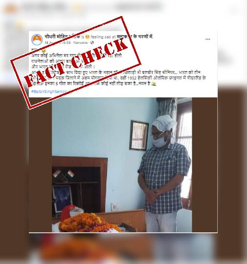 सोशल मीडिया पर एक तस्वीर वायरल हो रही है। तस्वीर एक मृत व्यक्ति के अंतिम बिदाई की है, जहां मृतक के शव पर फूलों की माला के साथ एक हॉकी स्टिक को रखें हुए देखा जा सकता है। दावा किया जा रहा है मरने वाले शख्स भारत के दिग्गज हॉकी खिलाड़ी बलबीर सिंह हैं, जिन्होंने भारत को तीन ओलंपिक स्वर्ण पदक जितवाए हैं। पोस्ट में कहा गया है कि उनके निधन की खबर पर मीडिया और राजनेता खामोश हैं।