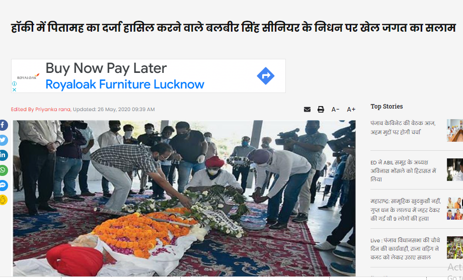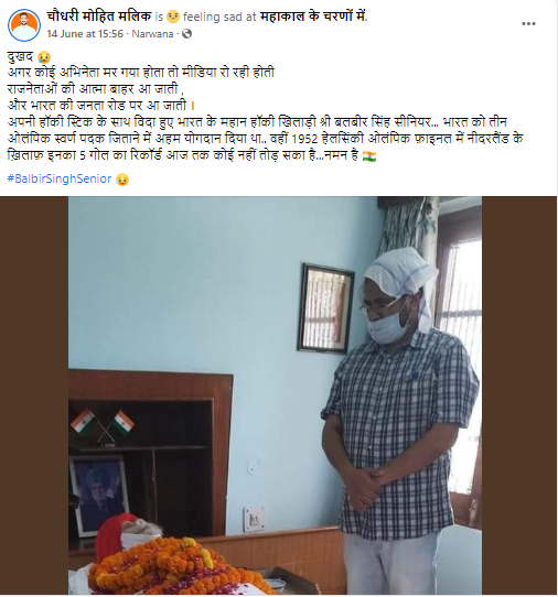 फेसबुक पर उनकी तस्वीर शेयर कर लिखा गया है कि,’ दुखद, अगर कोई अभिनेता मर गया होता तो मीडिया रो रही होती, राजनेताओं की आत्मा बाहर आ जाती, और भारत की जनता रोड पर आ जाती। अपनी हॉकी स्टिक के साथ विदा हुए भारत के महान हॉकी खिलाड़ी श्री बलबीर सिंह सीनियर… भारत को तीन ओलंपिक स्वर्ण पदक जिताने में अहम योगदान दिया था वहीं 1952 हेलसिंकी ओलंपिक फ़ाइनल में नीदरलैंड के ख़िलाफ़ इनका 5 गोल का रिकॉर्ड आज तक कोई नहीं तोड़ सका है…नमन है’
