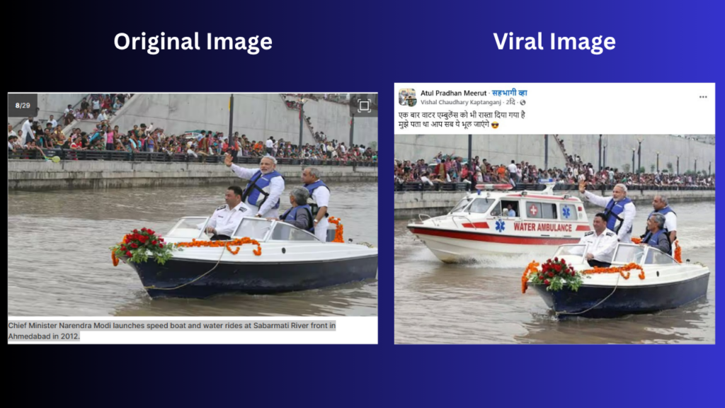 रिवर्स इमेज सर्च में पता चला कि यह तस्वीर साल 2012 की है, जब नरेंद्र मोदी गुजरात के मुख्यमंत्री थे। उस समय यह फोटो अहमदाबाद के साबरमती रिवरफ्रंट पर स्पीडबोट और वॉटर एक्टिविटी के लॉन्च के दौरान ली गई थी।