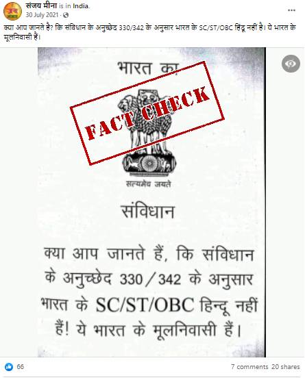 सोशल मीडिया पर भारतीय संविधान के अनुच्छेद 330/342 को लेकर एक पोस्ट वायरल हो रही है। पोस्ट में दावा किया जा रहा है संविधान के अनुच्छेद 330/342 में बताया गया है कि भारत में रहने वाले SC/ST और OBC श्रेणी के लोग हिन्दू नहीं है और वह लोग भारत के मूल निवासी हैं। फेसबुक पर इस पोस्ट को शेयर करते हुए लिखा गया है कि,”क्या आप जानते है? कि संविधान के अनुच्छेद 330/342 के अनुसार भारत के SC/ST/OBC हिंदू नहीं है। ये भारत के मूलनिवासी हैं।”
