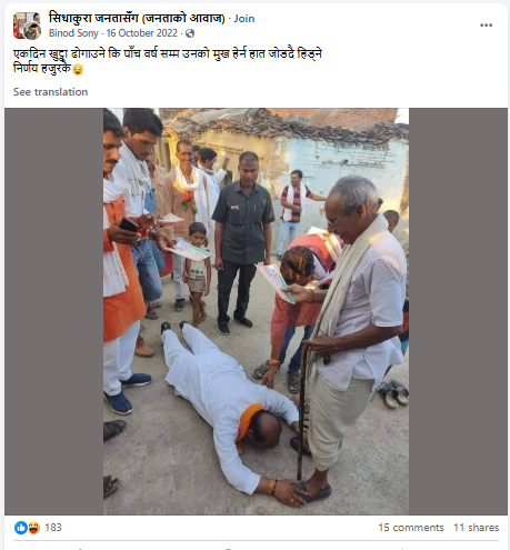 सोशल मीडिया पर एक तस्वीर तेजी से शेयर हो रही है, जिसमें एक राजनीतिक नेता को कुछ लोगों की भीड़ के बीच एक व्यक्ति के पैरों पर गिरते हुए देखा जा सकता है। इस वीडियो को सोशल मीडिया पर शेयर कर दावा किया जा रहा है कि बिहार चिनाव में नेता ऐसे वोट मांग रहे हैं।