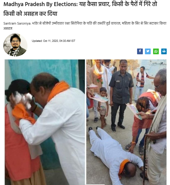 पड़ताल के दौरान मिले तथ्यों से हमने जाना कि वायरल तस्वीर हालिया बिहार चुनावों की नहीं बल्कि यह तस्वीर साल 2020 के दौरान की है जहां मध्य प्रदेश भांडेर विधानसभा क्षेत्र से बीजेपी उम्मीदवार रक्षा सिरोनिया के पति संतराम सिरोनिया अपनी जनता के पैरों में गिर कर वोट मांग रहे थे।