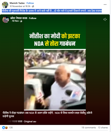 फेसबुक पर वायरल वीडियो को शेयर कर हिंदी भाषा के कैप्शन में लिखा गया है कि “नीतीश जी गुजराती गिरोह के दवाब में आने वाले नहीं है…..दो चोर चले थे इनको ठिकाने लगाने, अब देख तमाशा”