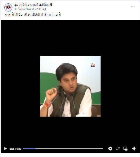 फेसबुक पर वायरल वीडियो को शेयर कर हिंदी भाषा के कैप्शन में लिखा गया है कि, “लगता है सिंधिया जी का बीजेपी में दिन भर गया है”