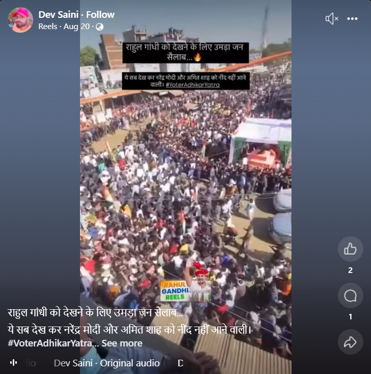 Facebook पर एक यूजर ने वीडियो पोस्ट करते हुए लिखा, “राहुल गांधी को देखने के लिए उमड़ा जन सैलाब…”, यह वीडियो अगस्त 20, 2025 को पोस्ट किया गया है.