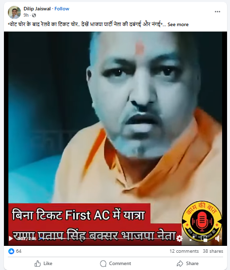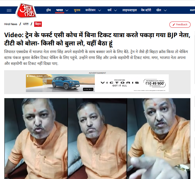 प्राप्त लेख में पुष्टि की गयी है कि वायरल वीडियो में बिना टिकट वाला शख्स बीजेपी से बक्सर पूर्व जिला अध्यक्ष राणा प्रताप सिंह है जो अपने एक सहयोगी के साथ ट्रेन के फर्स्ट एसी कोच में बिना टिकट यात्रा करते हुए टिकट चेकिंग स्टाफ द्वारा पकड़ा गया था।