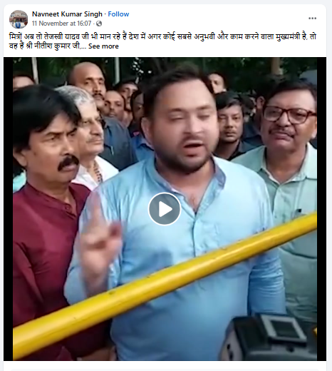 फेसबुक पर वायरल वीडियो को शेयर कर हिंदी भाषा के कैप्शन में लिखा गया है कि “मित्रों अब तो तेजस्वी यादव जी भी मान रहे हैं देश में अगर कोई सबसे अनुभवी और काम करने वाला मुख्यमंत्री है, तो वह हैं श्री नीतीश कुमार जी।”