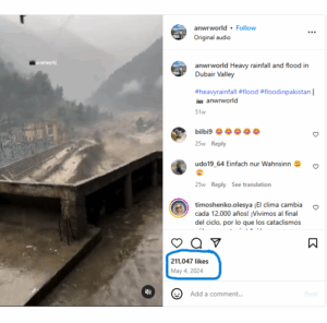 हमने इस वीडियो को देखा और जाना कि यह वीडियो भ्रामक दावे का साथ शेयक किया जा रहा है. इस वीडियो की सच्चाई जानने के लिए हमने सबसे पहले इसकी तस्वीर को गूगल लेंस पर डाला और उसके जरिए सच्चाई को खोजना शुरू किया. इस खोज में हमें Instagram का एक वीडियो मिला, जो मई 04, 2024 का था जिसकी कैप्शन में लिखा था, “Heavy rainfall and flood in Dubair Valley”