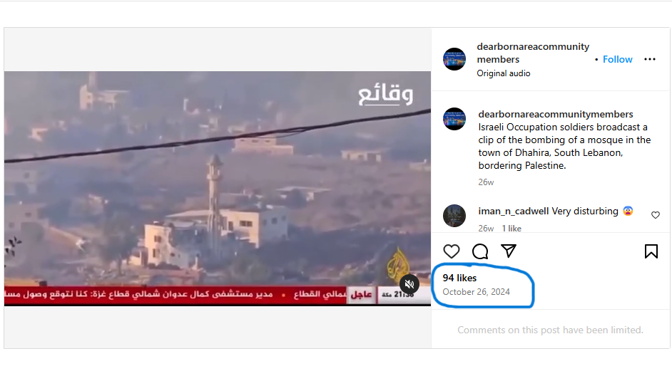 हमने इस वीडियो को देखा और जाना कि यह वीडियो भ्रामक दावे का साथ शेयक किया जा रहा है. इस वीडियो की सच्चाई जानने के लिए हमने सबसे पहले इसकी तस्वीर को गूगल लेंस पर डाला और उसके जरिए सच्चाई को खोजना शुरू किया. इस खोज में हमें Instagram का एक वीडियो मिला, जो ऑक्टूबर 26, 2024 का था जिसकी कैप्शन में लिखा था, Israeli Occupation soldier broadcast a clip of the bombing of a mosque in the town of Dhahira, South Lebanon, bordering Palestine