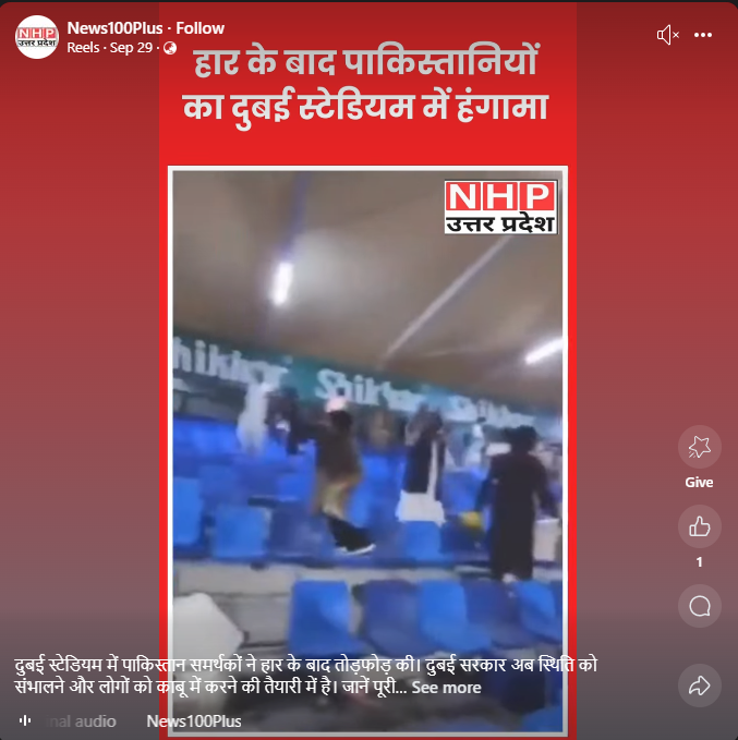 Facebook पर यूजर ने वीडियो पोस्ट करते हुए लिखा, ‘हार के बाद पाकिस्तानियों का दुबई स्टेडियम में हंगामा’ यूजर ने यह वीडियो सितंबर 29, 2025 को पोस्ट किया था.