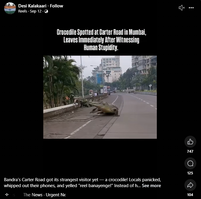 Facebook पर इस वीडियो को यूजर ने पोस्ट करते हुए लिखा, “Crocodile Spotted at Carter Road in Mumbai, Leaves Immediately After Witnessing Human Stupidity” यूजर ने यह वीडियो सितंबर 12, 2025 को पोस्ट किया.