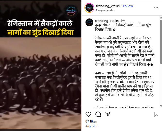 Instagram पर एक यूजर ने वीडियो पोस्ट करते हुए लिखा, “रेगिस्तान में सैकड़ों काले नागों का झुंड दिखाई दिया” यह वीडियो अगस्त 16, 2025 को पोस्ट किया गया है.