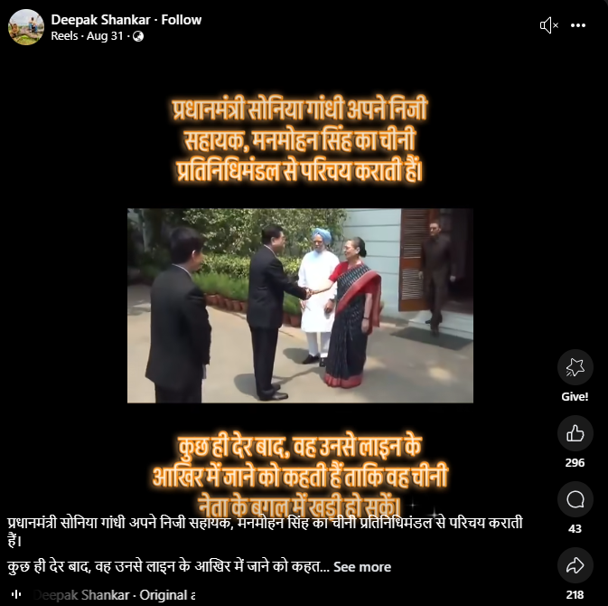 Facebook पर एक यूजर ने वीडियो पोस्ट करते हुए लिखा, “सोनिया गांधी ने अपने निजी सहायक, मनमोहन सिंह का चीनी प्रतिनिधिमंडल से परिचय कराती है. कुछ ही देर बाद, वह उनसे लाइन के आखिरी में जाने को कहती है ताकि वह चीनी तेना के बगल में खड़ी हो सकें” यह वीडियो अगस्त 31, 2025 को पोस्ट किया गया था