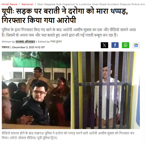 उपरोक्त मिली जानकारी के मुताबिक यह घटना साल 2021 के दौरान की है। उपरोक्त प्राप्त जानकारी की पुष्टि के लिए हमने गूगल पर बारीकी से खोजना शुरू कर दिया। खोज के दौरान हमें वायरल वीडियो का एक कीफ्रेम जनसत्ता की वेबसाइट पर दिसंबर 03, 2021 को प्रकाशित लेख में भी मिला। यहाँ भी जानकारी दी गयी है कि वायरल घटना साल 2021 के दौरान की है, जहां दिल्ली में अधिवक्ता प्रियांक माथुर ने पीलीभीत में तैनात दरोगा विनोद कुमार को थप्पड़ जड़े थे।