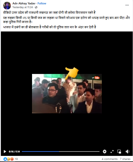फेसबुक पर वायरल वीडियो को शेयर कर हिंदी भाषा के कैप्शन में लिखा गया है कि “वीडियो उत्तर प्रदेश की राजधानी लखनऊ का जहां योगी जी हमेशा विराजमान रहते हैं, यह लड़का किसी IPS या किसी जज का लड़का था जिसने सरेआम एक दरोगा को थप्पड़ मरते हुए बार-बार पीटा और कहा पुलिस गिरी करता है। भाजपा में दबंगों का ही बोलबाला है गरीबों को तो पुलिस लात मार के अंदर कर देती है।”
