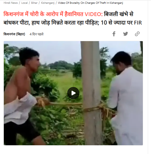 वेबसाइट के मुताबिक वायरल वीडियो बिहार के किशनगंज स्थित बहादुरगंज का है, जहां चोरी के आरोप में कुछ लोगों ने लोहागड़ा हाट निवासी नूर आलम के 18 वर्षीय पुत्र मासूम रजा को बिजली के खंभे में बांधकर बेरहमी से पीटा था।