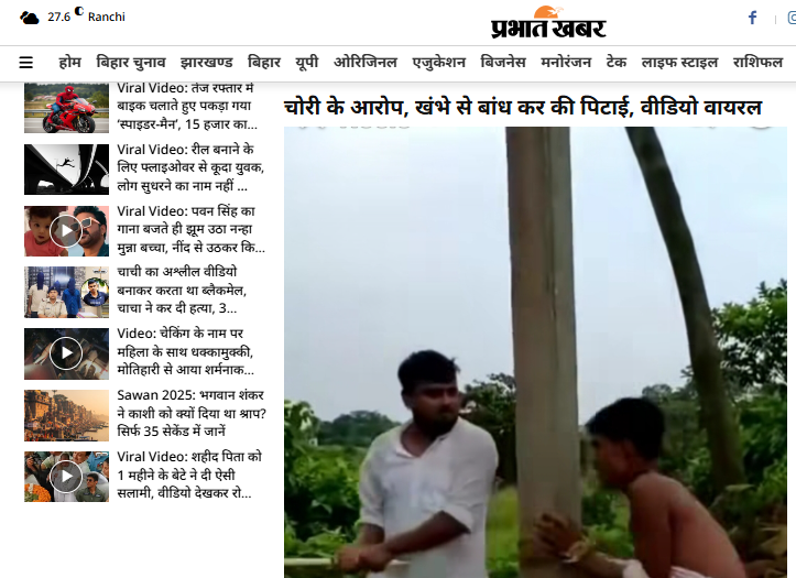 यहाँ भी वायरल वीडियो की जानकारी देते हुए इस घटना को बिहार के किशनगंज का बताया गया है। रिपोर्ट के मुताबिक इस मामले में लोहागड़ा हाट निवासी नूर आलम के 18 वर्षीय पुत्र मासूम राजा के फर्द बयान पर बहादुरगंज पुलिस ने प्राथमिकी में चार नामजद एवं 10 से 15 अज्ञात के विरुद्ध मामला दर्ज किया है। रिपोर्ट में घटना बीते 16 अगस्त शनिवार दिन के 11 बजे झांसी रानी चौक बहादुरगंज की है।