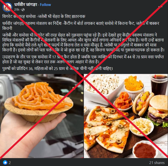 Facebook पर एक यूजर ने पोस्ट करते हुए लिखा, “सिगरेट की तरह समोसा-जलेबी भी सेहत के लिए खतरनाक (धर्मवीर जांगड़ा/ स्वास्थ्य मंत्रालय का निर्देश- कैंटीन में बोर्ड लगाकर बताएं समोसे में कितना फैट, जलेबी में कितनी शक्कर)” यूजर ने पोस्ट जुलाई 15, 2025 को पोस्ट किया है.