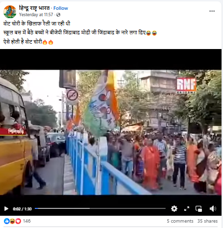 सोशल मीडिया पर त्रिमूल कांग्रेस की रैली का वीडियो तेजी से वायरल हो रहा है। वीडियो में जहाँ एक तरफ तृणमूल कांग्रेस के कार्यर्कता रैली निकाल रहे थे वहीं दूसरी तरफ सड़क की दूसरी तरफ खड़ी स्कूली बस में बैठे बच्चे बीजेपी जिंदाबाद के नारे लगा रहे हैं। इसी वीडियो को सोशल मीडिया पर शेयर कर दावा किया जा रहा है कि बंगाल में वोट चोरी के खिलाफ रैली के दौरान स्कूली बच्चों ने बीजेपी जिंदाबाद के नारे लगाए।