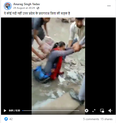 सोशल मीडिया पर एक वीडियो वायरल हो रहा है, वीडियो में एक युवती को सड़क पर कीचड़ के गड्ढे में फंसे हुए देखा जा सकता है, कीचड़ में फंसी युवती को कुछ युवक उसे वहां से बाहर निकाल रहे हैं। वीडियो में गौर किया जा सकता है कि सड़क पर जलभराव जैसी स्थिति बनी हुई है। इसी वीडियो को सोशल मीडिया पर शेयर कर दावा किया जा रहा है कि यह वीडियो उत्तर प्रदेश के प्रयागराज शहर का है।