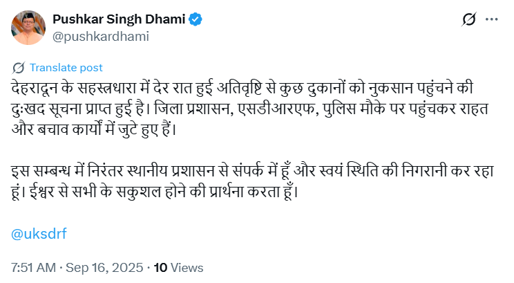 उत्तराखंड के मुख्यमंत्री पुष्कर सिंह धामी ने ट्वीट करते हुए लिखा, “देहरादून के सहस्त्रधारा में देर रात हुई अतिवृष्टि से कुछ दुकानों को नुकसान पहुंचने की दुःखद सूचना प्राप्त हुई है. जिला प्रशासन, एसडीआरएफ, पुलिस मौके पर पहुंचकर राहत और बचाव कार्यों में जुटे हुए हैं. इस सम्बन्ध में निरंतर स्थानीय प्रशासन से संपर्क में हूँ और स्वयं स्थिति की निगरानी कर रहा हूं. ईश्वर से सभी के सकुशल होने की प्रार्थना करता हूँ.”