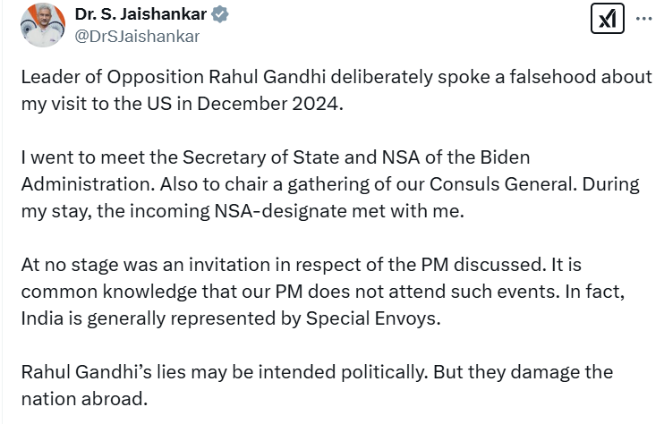 विदेश मंत्री डॉ. एस जयशंकर ने ट्वीट किया, “विपक्ष के नेता राहुल गांधी ने जानबूझकर दिसंबर 2024 में मेरी अमेरिका यात्रा के बारे में झूठ बोला. मैं बाइडेन प्रशासन के विदेश मंत्री और NSA से मिलने गया था. साथ ही हमारे महावाणिज्य दूतों की एक बैठक की अध्यक्षता भी की. मेरे प्रवास के दौरान, आने वाले NSA-पदनाम ने मुझसे मुलाकात की. किसी भी स्तर पर पीएम के संबंध में निमंत्रण पर चर्चा नहीं की गई. यह सर्वविदित है कि हमारे पीएम ऐसे कार्यक्रमों में शामिल नहीं होते हैं. वास्तव में, भारत का प्रतिनिधित्व आमतौर पर विशेष दूतों द्वारा किया जाता है. राहुल गांधी के झूठ का राजनीतिक उद्देश्य हो सकता है. लेकिन वे विदेश में देश को नुकसान पहुंचाते हैं.”