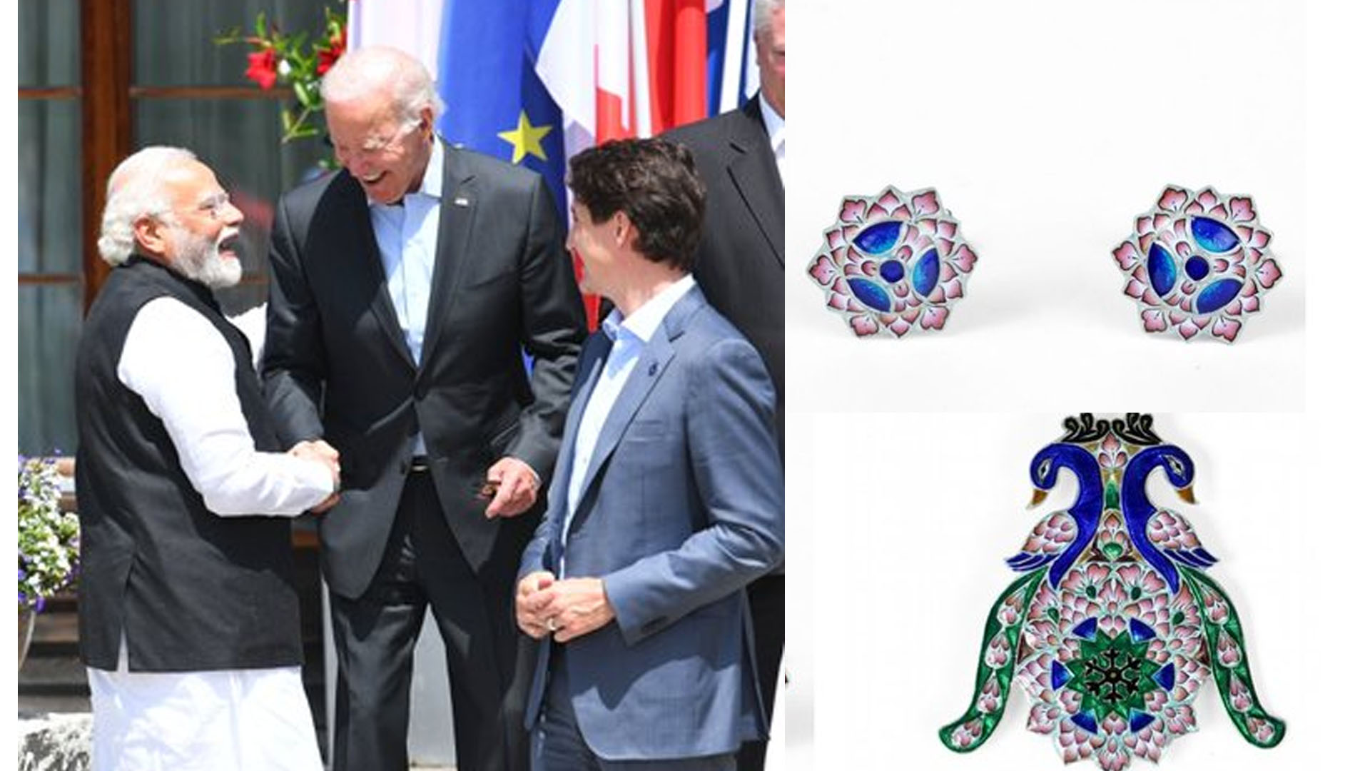 प्रधानमंत्री नरेंद्र मोदी ने अमेरिकी राष्ट्रपति जो बाइडेन को वाराणसी, उत्तर प्रदेश से गुलाबी मीनाकारी ब्रोच और कफ़लिंक सेट उपहार में दिया है.