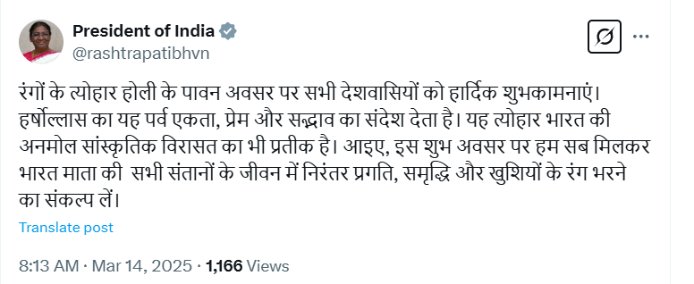 राष्ट्रपति द्रौपदी मुर्मू ने ट्वीट किया, “रंगों के त्योहार होली के पावन अवसर पर सभी देशवासियों को हार्दिक शुभकामनाएं. हर्षोल्लास का यह त्योहार एकता, प्रेम और सद्भाव का संदेश देता है. यह त्योहार भारत की अनमोल सांस्कृतिक विरासत का भी प्रतीक है. इस पावन अवसर पर आइए हम सब मिलकर मां भारती की सभी संतानों के जीवन में निरंतर प्रगति, समृद्धि और खुशियों के रंग भरने का संकल्प लें.”