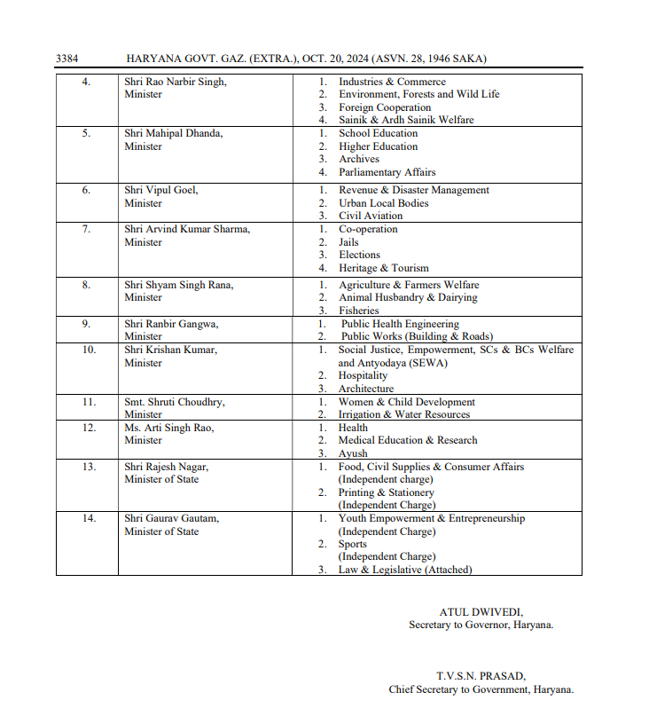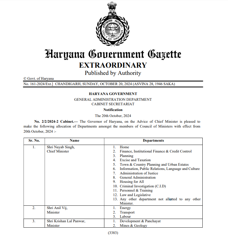 हरियाणा: नई कैबिनेट के बीच हुआ मंत्रालयों का बंटवारा, यहाँ देखें किस मंत्री को मिला कौन-सा मंत्रालय