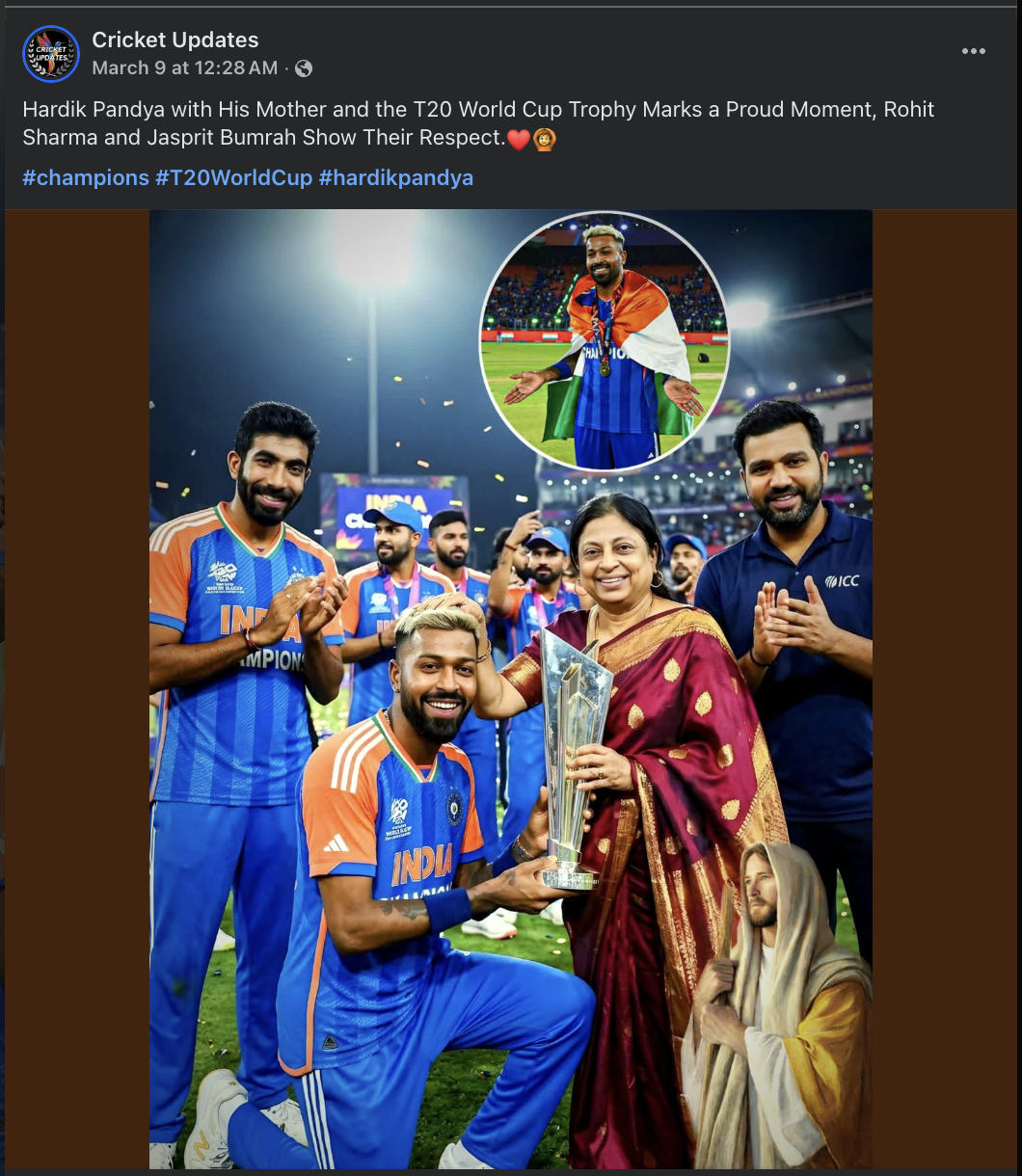 यह पोस्ट फेसबुक पर एक कैप्शन के साथ साझा किया गया, जिसमें कहा गया कि हार्दिक पंड्या, रोहित शर्मा और जसप्रीत बुमराह के साथ मिलकर अपनी मां के प्रति सम्मान व्यक्त कर रहे हैं और यह एक गर्व का क्षण है।