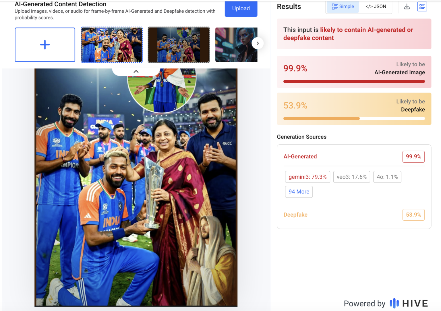 AI डिटेक्शन टूल Hive Moderation के विश्लेषण में पाया गया कि यह इमेज 99.9% AI-जनरेटेड है। वहीं Sightengine टूल ने भी इसे लगभग 98% AI-जनरेटेड बताया।