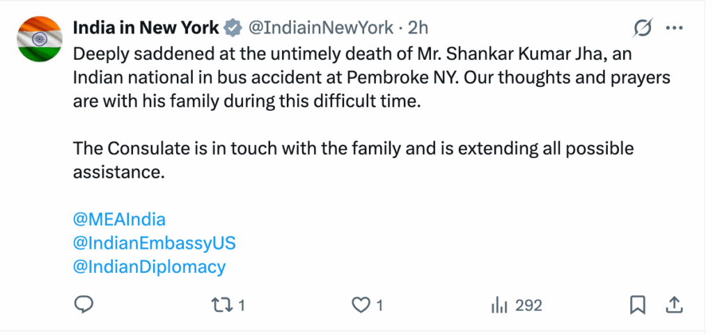 अमेरिका के न्यूयॉर्क में एक बड़ा सड़क हादसा हुआ है। 22 अगस्त को नियाग्रा फॉल्स से न्यूयॉर्क सिटी जा रही एक टूर बस इंटरस्टेट 90 हाईवे पर पलट गई, जिसमें 5 लोगों की मौत हो गई। मरने वालों में भारत के बिहार राज्य के मधुबनी जिले के रहने वाले 65 वर्षीय शंकर कुमार झा भी शामिल हैं। यह हादसा स्थानीय समयानुसार दोपहर 12:22 बजे पेमब्रोक के पास हुआ। न्यूयॉर्क स्टेट पुलिस के अनुसार, बस अचानक कंट्रोल खो बैठी, पहले डिवाइडर में घुसी, फिर ओवर-करेक्शन करते हुए गड्ढे में पलट गई। पुलिस ट्रूपर जेम्स ओ’कैलाहन ने प्रेस ब्रीफिंग में बताया, “वाहन ने कंट्रोल खो दिया, मीडियन में गया, फिर ज्यादा मोड़ने की कोशिश में गड्ढे में पलट गया।”