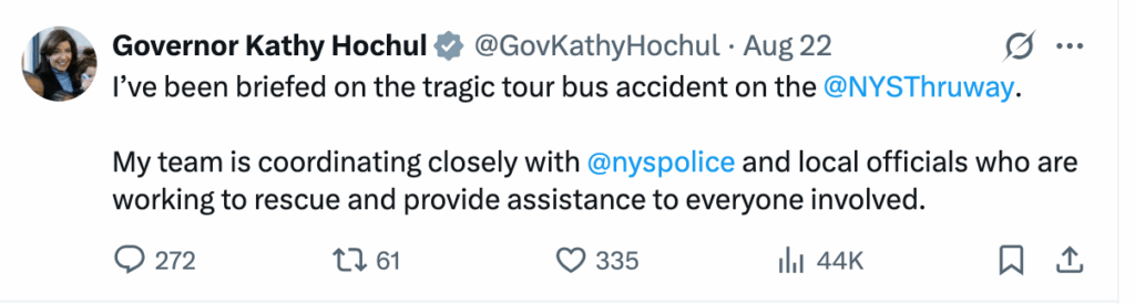 पुलिस ने बताया कि कई यात्री सीट बेल्ट नहीं लगाए हुए थे, जिस वजह से कई लोग बस से बाहर फेंक दिए गए। हादसे के बाद बस की हालत “बेहद खराब” बताई गई। न्यूयॉर्क की गवर्नर कैथी होचुल ने सोशल मीडिया पर लिखा कि उनकी टीम न्यूयॉर्क स्टेट पुलिस और स्थानीय अधिकारियों के साथ मिलकर राहत कार्य कर रही है। इस हादसे में 40 से ज्यादा यात्रियों को अस्पताल में भर्ती कराया गया है। कई लोगों को सिर की चोट, हड्डी टूटने और अन्य गंभीर चोटें आई हैं।