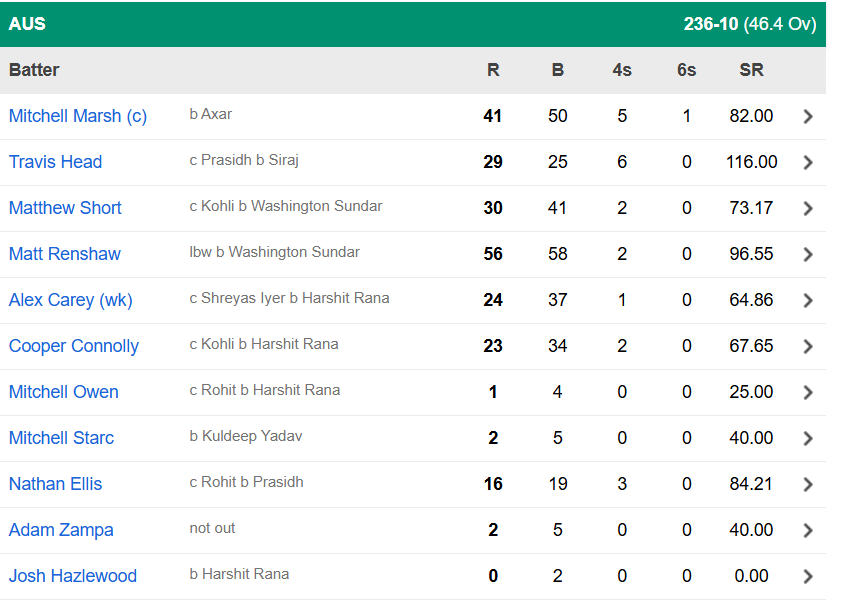 भारत और ऑस्ट्रेलिया के बीच आखिरी मुकाबला सिडनी क्रिकेट ग्राउंड (SCG) में खेला जा रहा है. जहां ऑस्ट्रेलियाई कप्तान मिचेल मार्श ने टॉस जीतकर पहले बल्लेबाजी करने का फैसला लिया. पहले बल्लेबाजी करते हुए ऑस्ट्रेलिया 46.4 ओवरों में महज 236 रनों के निजी स्कोर पर सिमट गई. अपनी टीम के लिए रेनशॉ ने सर्वाधिक 56 रन की पारी खेली वहीं कप्तान मार्श ने 41 रन बनाए.